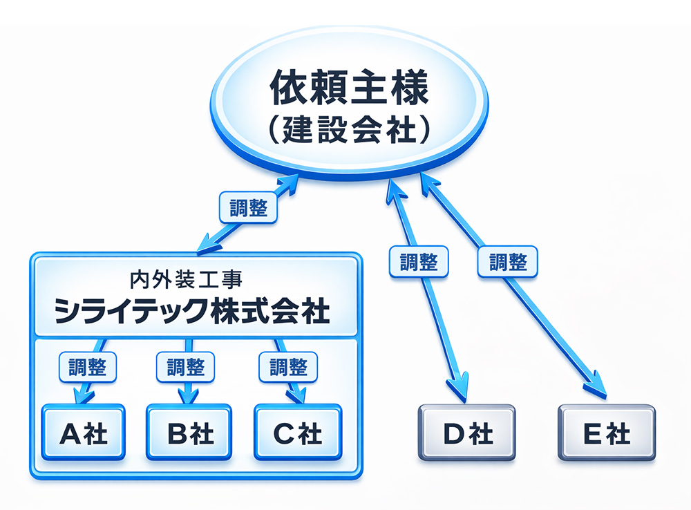 依頼主様(建設会社様)は各業種ごとに協力業者に依頼し、各会社と工程や進捗を管理し、現場管理を行います。 シライテックでは内外装工事を一貫して請負うことで、各社との調整が不要になり負担が軽減できます。 また、進捗状況を考慮して微妙なスケジュールの調整などができ、効率よく品質の高い工事が可能となります。